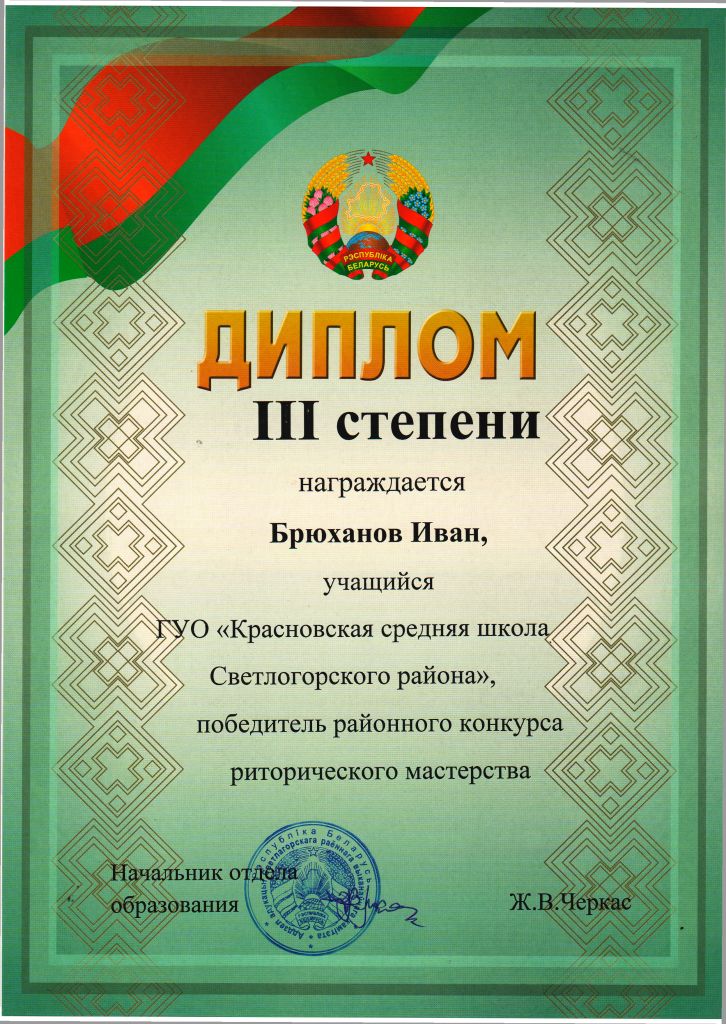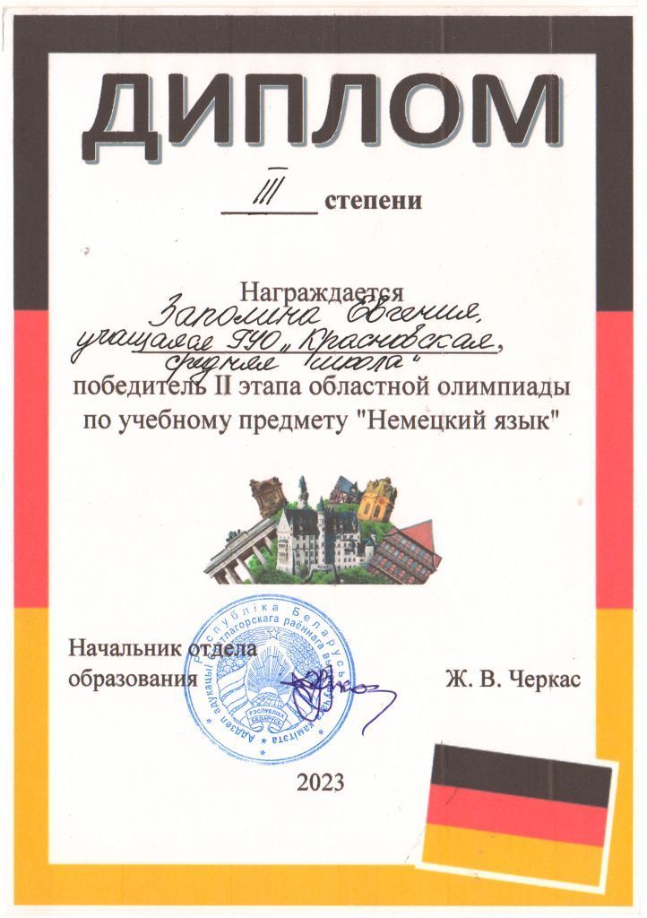 II этап областной олимпиады по немецкому языку – Диплом III степени (Старовойтов Дмитрий, учащихся IX класса).