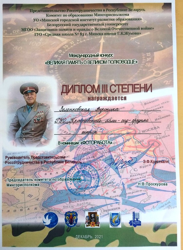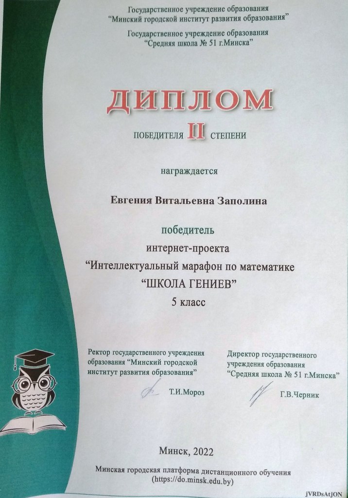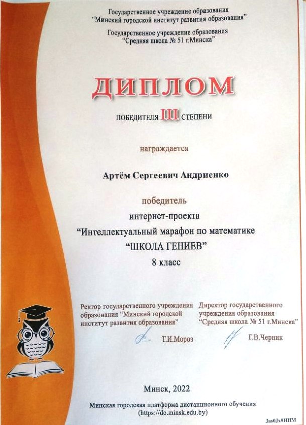 Интеллектуальный марафон по математике “ШКОЛА ГЕНИЕВ”(ГУО “Минский городской институт развития образования”, ГУО “Средняя школа №51 г.Минска”) Заполина Евгения, учащаяся V класса – Диплом II степени, Андриенко Артём, учащийся VIII класса – Диплом III степени, Семененко Михаил, учащийся VI класса, участник интернет-проекта.