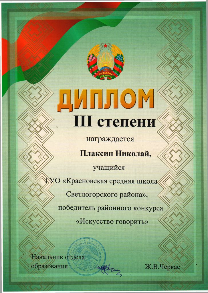 Районный этап конкурса (конкурс чтецов) «Захаваем свет разам» – Диплом III степени.