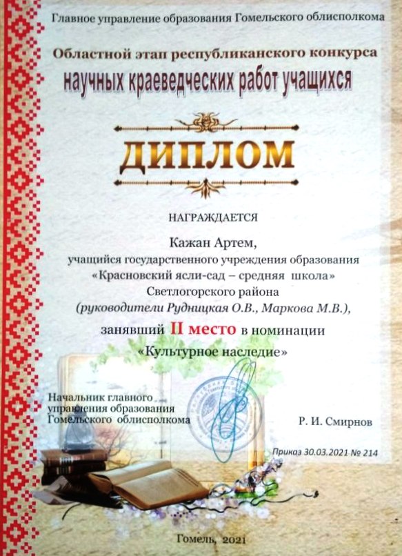 Областной этап республиканского конкурса научных исследовательских краеведческих работ учащихся в номинации «Культурное наследие» – Дипломом II степени (Кажан Артём, учащийся VIII класса).