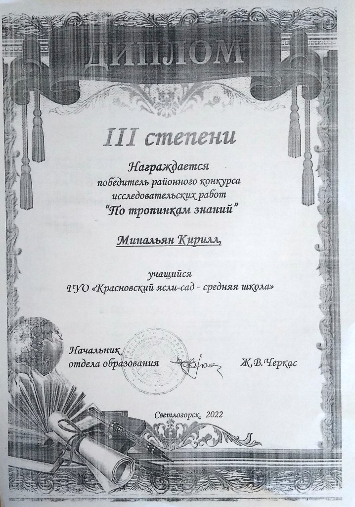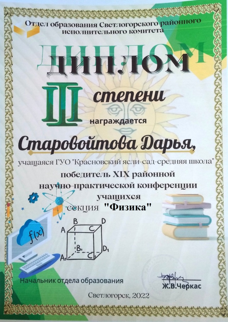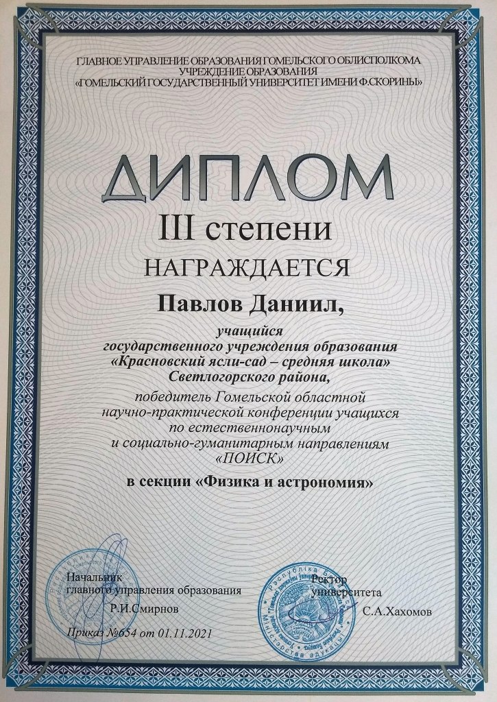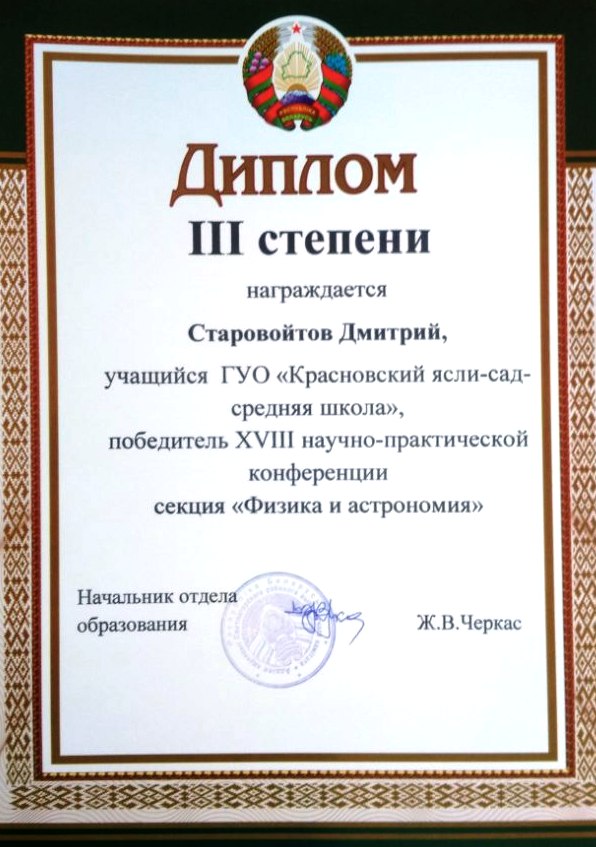 Гомельская областная НПК учащихся по естественнонаучным и социально-гуманитарным направлениям "ПОИСК" - Диплом III степени (секция физики и астрономии, Старовойтова Дарья, учащаяся IX класса)