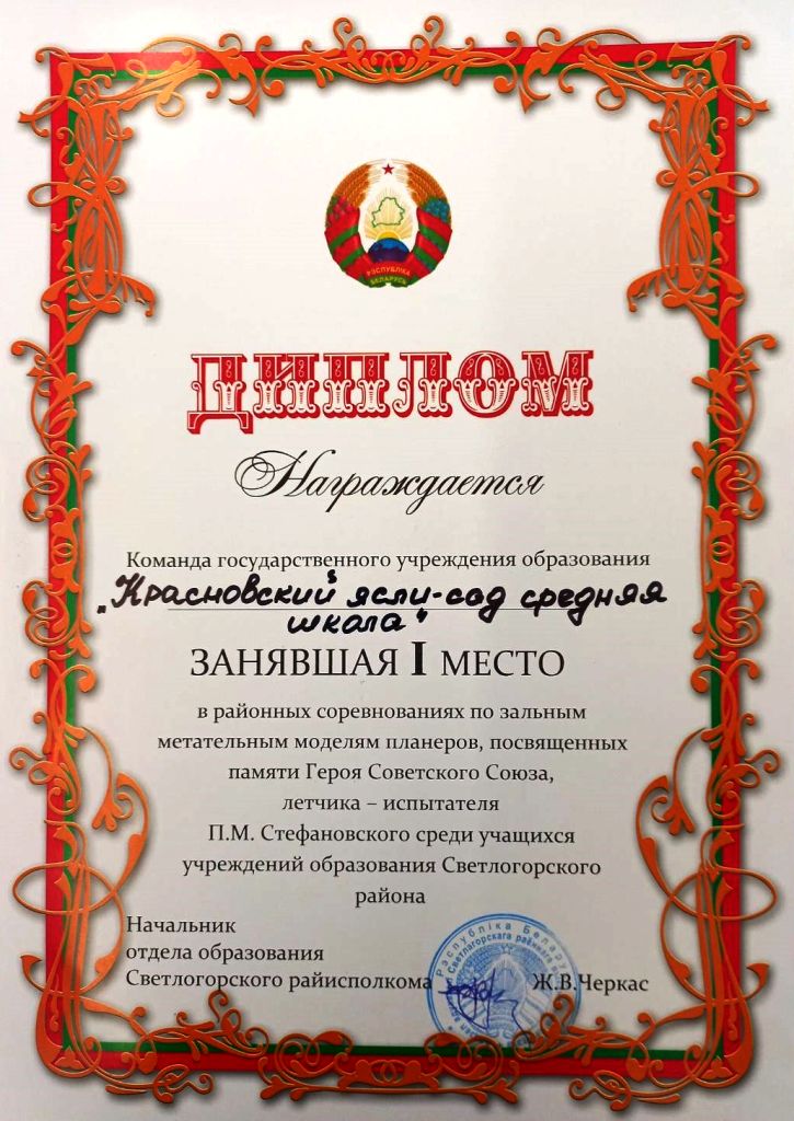 Районные соревнования по зальным метательным моделям планеров – Диплом I степени.